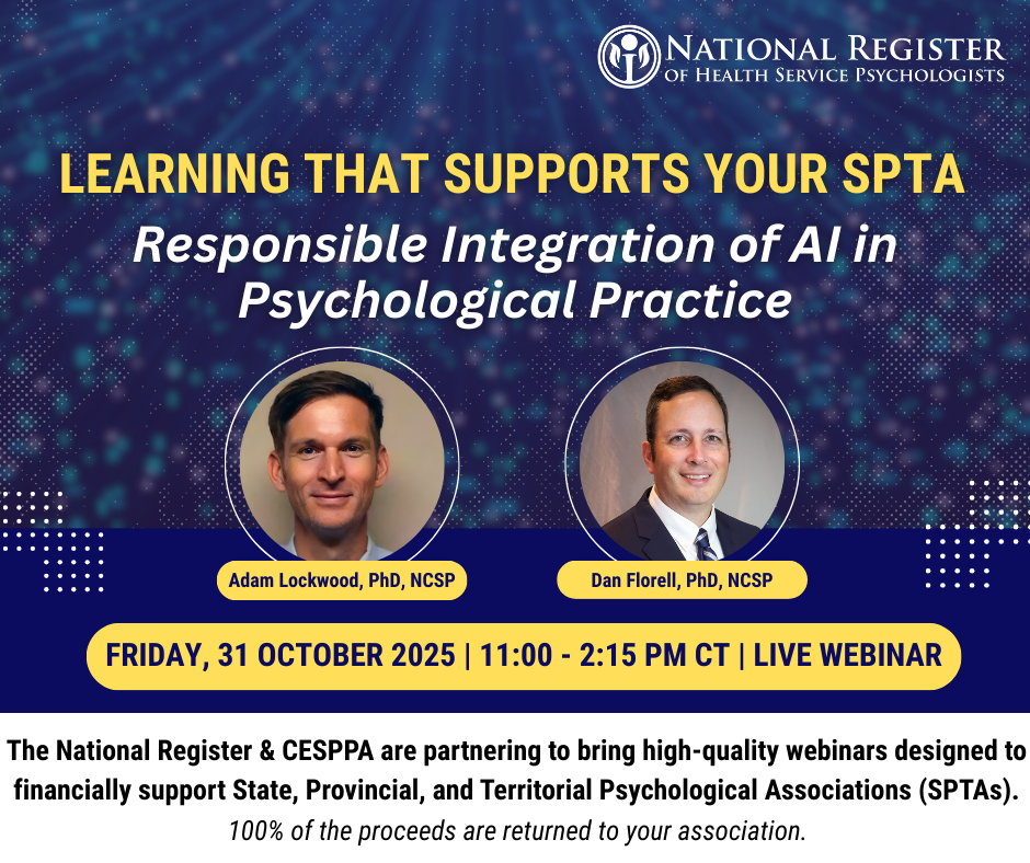 Please join us on October 31 for the clinical webinar Responsible Integration of AI in Psychological Practice, sponsored by the National Register of Health Service Psychologists in collaboration with the Council of Executives of State and Provincial Psychological Associations (CESPPA). All registration fees from our members will be returned to the Colorado Psychological Association (CPA).